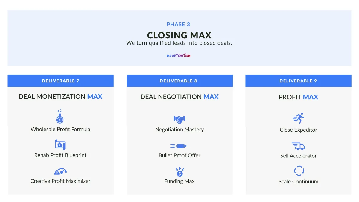 Our complete closing and disposition service where we take care of all of the closing and funding of your investment properties...then we get it sold and you make money.